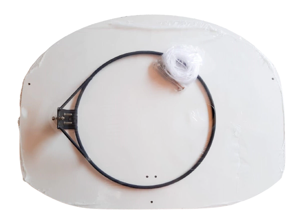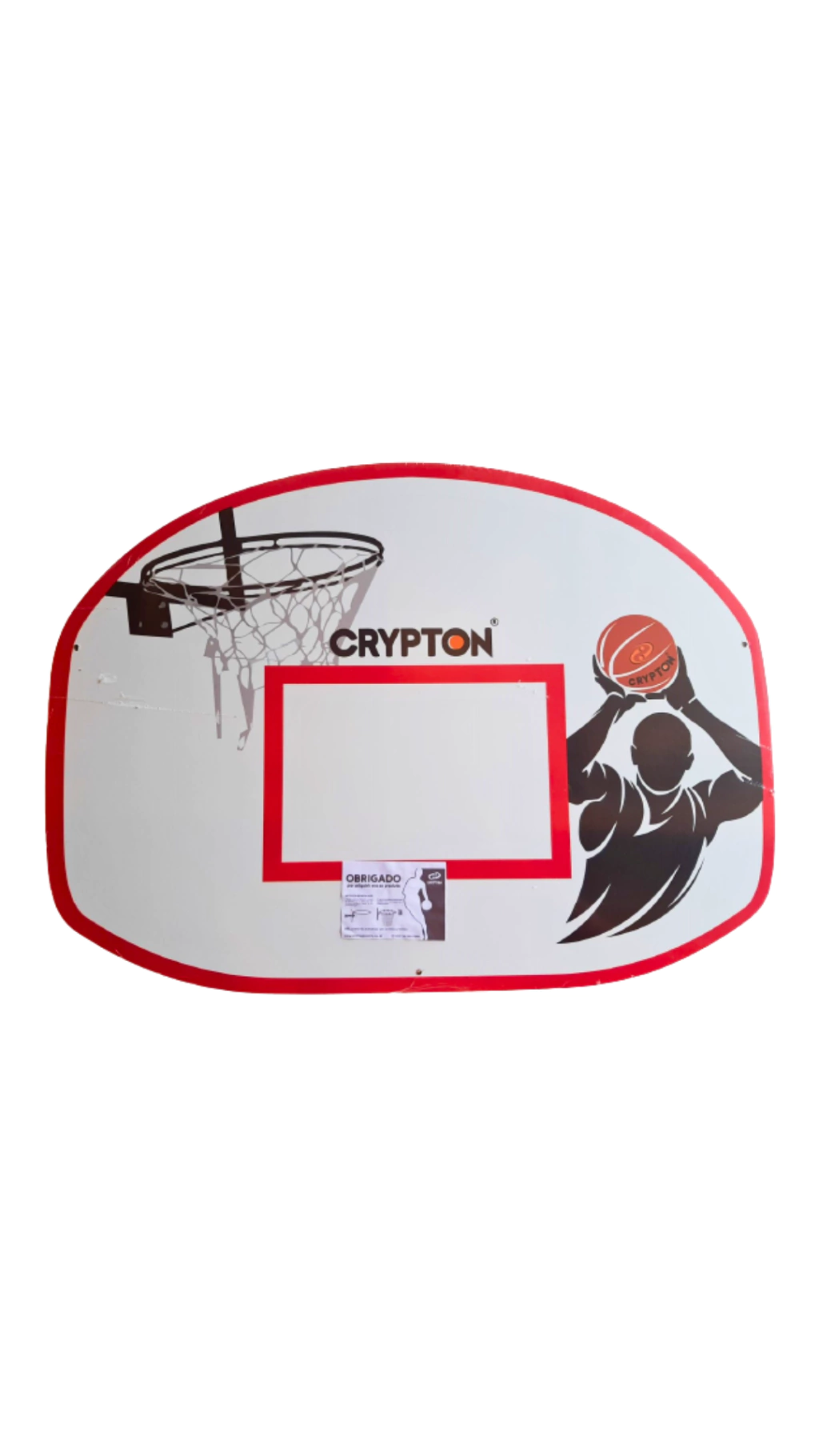 Acompanha aro de ferro no tamanho oficial, rede de nylon, presilhas de plástico para fixação da rede, parafusos para fixação do aro na tabela, parafusos e buchas para fixação da tabela na parede